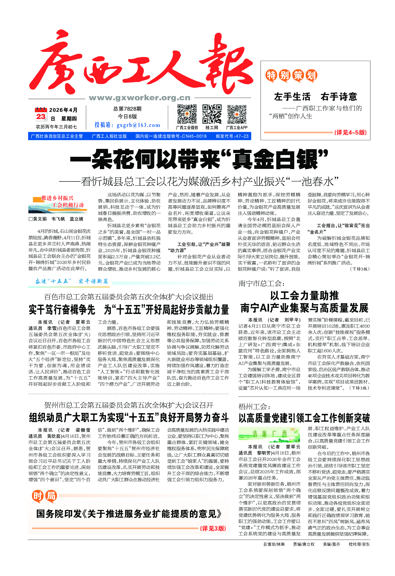 4月22日至23日,自治区人大常委会副主任、党组副书记,自治区总工会主席方春明率队到柳州市调研工会工作。…